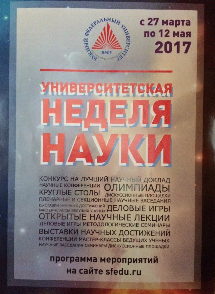 Кафедрой социологии, истории и политологии (СИП) ИУЭС ИТА ЮФУ в рамках Недели науки и Недели академической мобильности студентов был проведен научно-практический семинар “Герои Таганрогского подполья”. Семинар состоялся в ауд. Г-209 ИТА ЮФУ 4 апреля 2017 г.