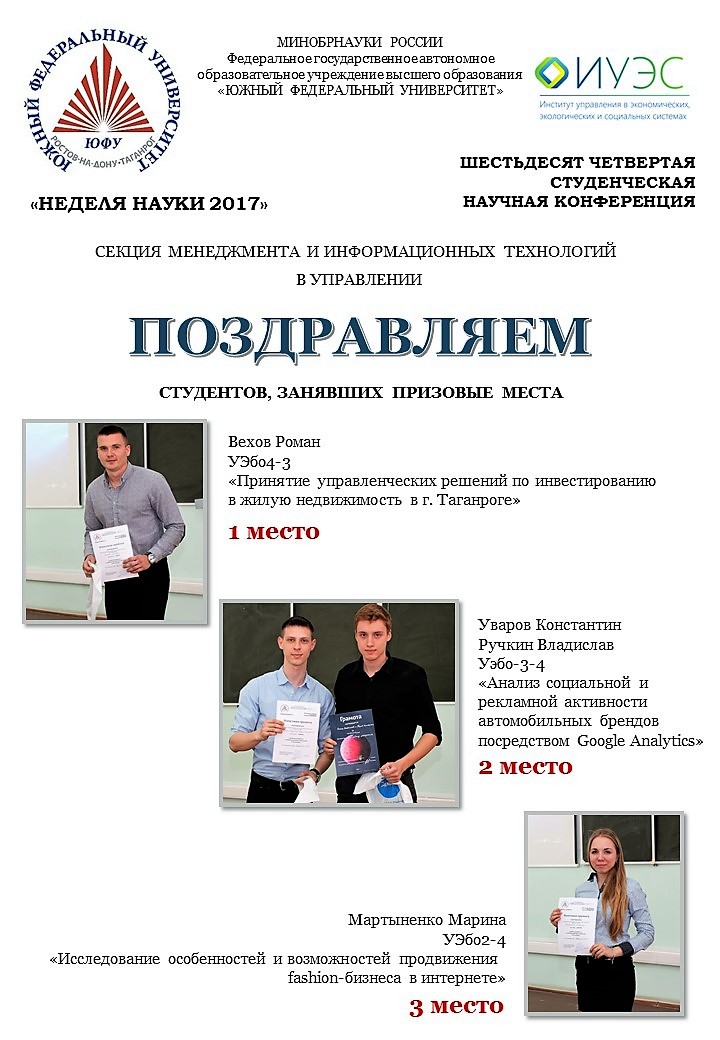 6 апреля 2017 года на кафедре Менеджмента и инновационных технологий ИУЭС ЮФУ в рамках «Недели науки ЮФУ-2017» была проведена студенческая научно-практическая конференция. Мероприятие получилось очень насыщенным и интересным! Спасибо всем участникам! Поздравляем победителей!