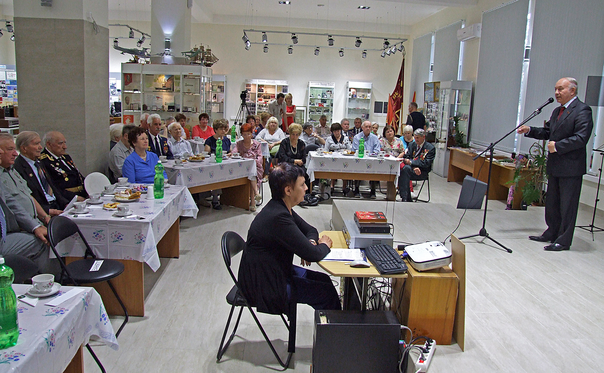 Ведущий вечера член Союза журналистов России Олег Набоков беседовал с гостями, сидевшими за столами, о времени прошлом и настоящем. С интересом слушали воспоминания ветерана Великой Отечественной войны, участника обороны Заполярья Владимира Моисеевича Черницера, который в мирные годы работал преподавателем ТРТИ – ЮФУ, стал одним из основателей в ОКБ «Миус» лаборатории спектрального корреляционного анализа гидроакустических сигналов.