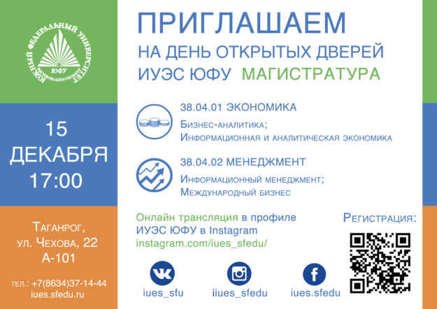15 декабря в 17.00 в Институте управления в экономических, экологических и социальных системах ЮФУ состоится День открытых дверей: магистерские программы. Для участия в мероприятии приглашаются выпускники высших учебных заведений. План мероприятия: Встреча с дирекцией ИУЭС ЮФУ; Разъяснение правил приема 2018 г; Презентация программ магистратуры; Ответы на интересующие вопросы. Для участия в мероприятии необходима предварительная регистрация: https://goo.gl/forms/qsSWM7LVYnoZ5C7b2 Онлайн трансляция в профиле ИУЭС ЮФУ в…