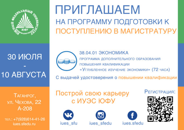 С 30 июля по 10 августа Институт управления в экономических, экологических и социальных системах проведет программу подготовку для поступающих в магистратуру по направлению подготовки 38.04.01 «Экономика». Для обучения по программе дополнительного образования и повышения квалификации «Углубленное изучение экономики» (72 часа) и получения удостоверения о повышении квалификации необходимо записаться по телефону +79286144126 С презентацией направлений магистратуры…