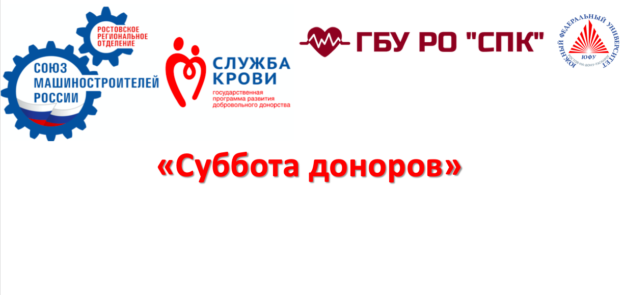 Ростовское региональное отделение «Союз машиностроителей России» приглашает сотрудников и студентов ЮФУ принять участие в акции «Суббота доноров». Она организована специально для тех людей, у кого нет возможности стать донором в будние дни. Всех желающих ждут по адресу: г. Ростов-на-Дону, ул. Ченцова, 71/63б 23 ноября, 28 декабря 2019 года, 4 января 2020 года с 8:30 до 13:00 При себе…