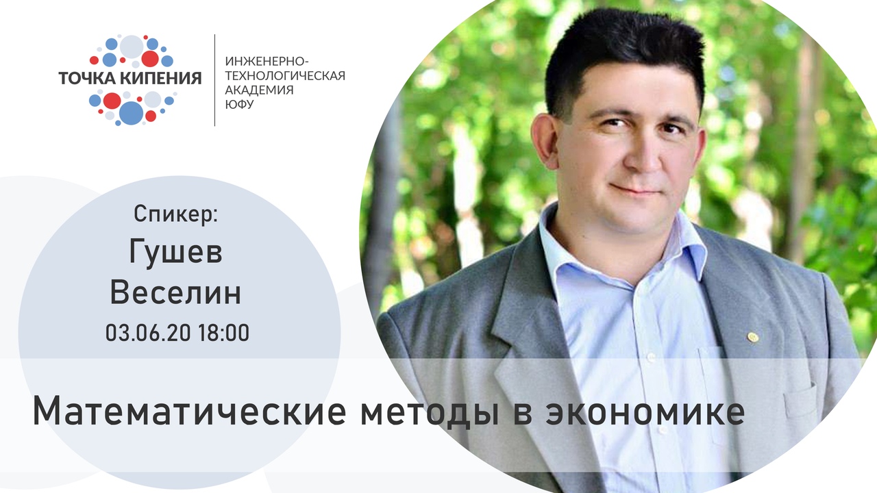 03 июня 2020 года в 18.00 (по московскому времени) в рамках работы Открытого дистанционного научно-популярного лектория Института управления в экономических, экологических и социальных системах Южного федерального университета «Open popular science lectures_IMES SFEDU»состоится открытая научно-популярная лекция на тему «Математические методы в экономике» от профессора Веселина Андреева Гушева (Софийский университет им. святого Климента Охридского, Болгария), который является визит-профессором Института управления в экономических, экологических и социальных системах Южного федерального университета.