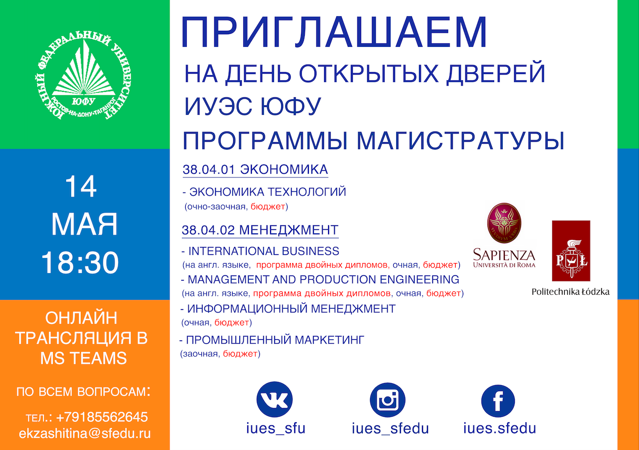 14 мая 2021 года в 18.30 Институт управления в экономических, экологических и социальных системах ЮФУ проведет в онлайн формате День открытых дверей: магистерские программы. Для участия в мероприятии приглашаются лица, имеющие диплом о высшем образовании, или выпускники бакалавриата и специалитета 2021 года.