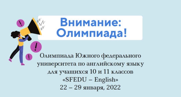 22 января 2022 состоялся первый тур организованной кафедрой Лингвистического образования Олимпиады Южного федерального университета по английскому языку «SFEDU – English», в котором приняли участие ребята из Таганрога, Ростова-на-Дону, Краснодара, а также из сельских поселений Ростовской области. Ребятам был предложено задание по модели cloze-test, с которым нужно было справиться за 40 минут. По условиям проведения Олимпиады…