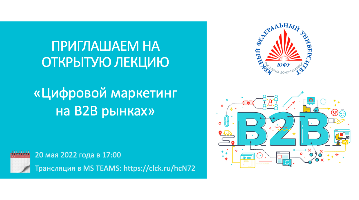 20 мая 2022 года в 17.00 (по московскому времени) в рамках работы Открытого дистанционного научно-популярного лектория Института управления в экономических, экологических и социальных системах Южного федерального университета «Open popular science lectures_IMES SFEDU»состоится открытая научно-популярная лекция на тему «Цифровой маркетинг на B2B рынках» от Алексея Владимировича Катаева, кандидата экономических наук, доцента кафедры Менеджмента и инновационных технологий Института управления в экономических, экологических и социальных системах, который также является руководителем образовательной программы «Промышленный маркетинг» по направлению 38.04.02 Менеджмент (заочная форма обучения).