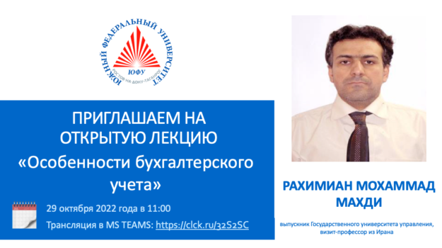 29 октября 2022 года в 11.00 (по московскому времени) в рамках Недели академической мобильности Южного федерального университета состоится научно-популярная лекция на площадке Открытого дистанционного научно-популярного лектория Института управления в экономических, экологических и социальных системах Южного федерального университета «Open popular science lectures_IMES SFEDU» на тему «Особенности бухгалтерского учета». Язык лекции — русский. Лектор — Рахимиан Мохаммад Махди, выпускник Государственного университета…