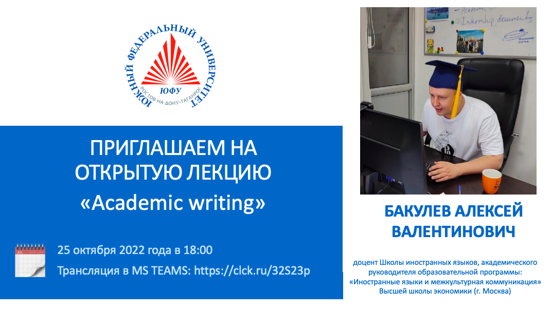 25 октября 2022 года в 18.00 (по московскому времени) в рамках Недели академической мобильности Южного федерального университета состоится научно-популярная лекция на площадке Открытого дистанционного научно-популярного лектория Института управления в экономических, экологических и социальных системах Южного федерального университета «Open popular science lectures_IMES SFEDU» на тему «Academic writing».