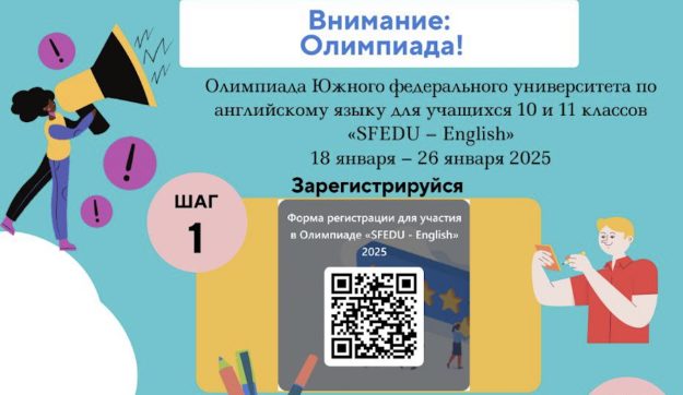 Кафедра лингвистического образования Института управления в экономических, экологических и социальных системах Южного федерального университета приглашает учащихся 10-11-х классов принять участие в Олимпиаде Южного федерального университета по английскому языку «SFEDU – English». Победители и призеры Олимпиады Южного федерального университета по английскому языку «SFEDU – English» получат дополнительные баллы в качестве индивидуальных достижений при поступлении на специальность…