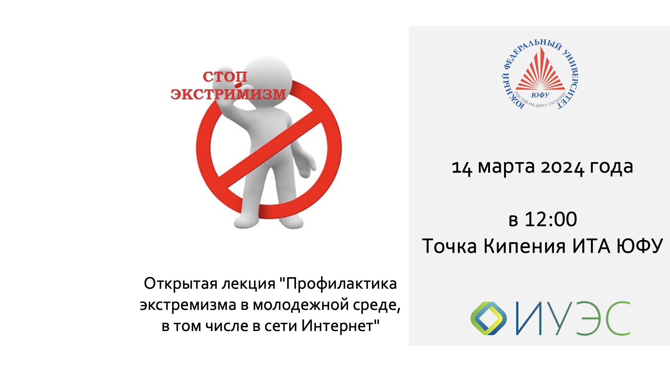 14 марта в 12.00 на площадке Точки кипения ИТА ЮФУ (г. Таганрог, ул. Шевченко 2) представители Таганрогской транспортной прокуратуры проведут для студентов Южного федерального университета открытую лекцию на тему «Профилактика экстремизма в молодежной среде, в том числе в сети Интернет».
