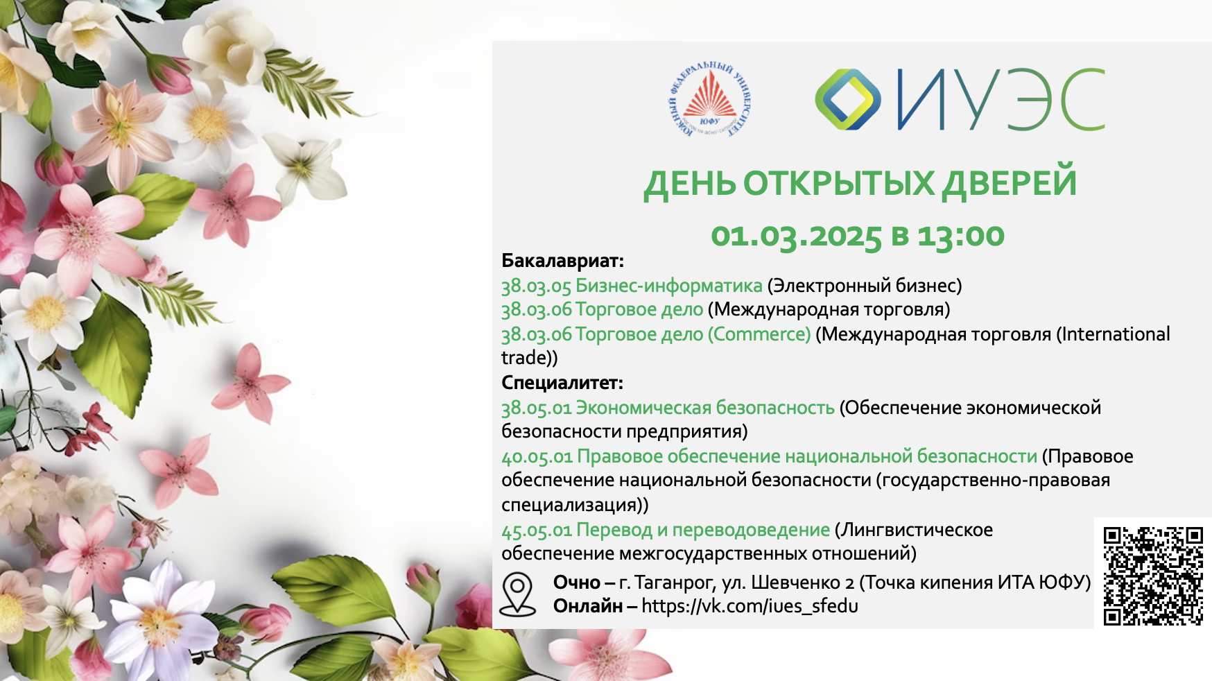 01 марта 2025 года в 13.00 Институт управления в экономических, экологических и социальных системах ЮФУ проведет День открытых дверей: направления бакалавриата и специалитета. Для участия в мероприятии приглашаются выпускники школ и средних учебных заведений, а также все заинтересованные лица.