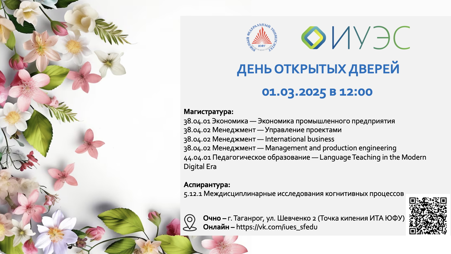 01 марта 2025 года в 12.00 Институт управления в экономических, экологических и социальных системах ЮФУ проведет День открытых дверей по программам магистратуры и аспирантуры. Для участия в мероприятии приглашаются лица, имеющие диплом о высшем образовании, или выпускники 2025 года.