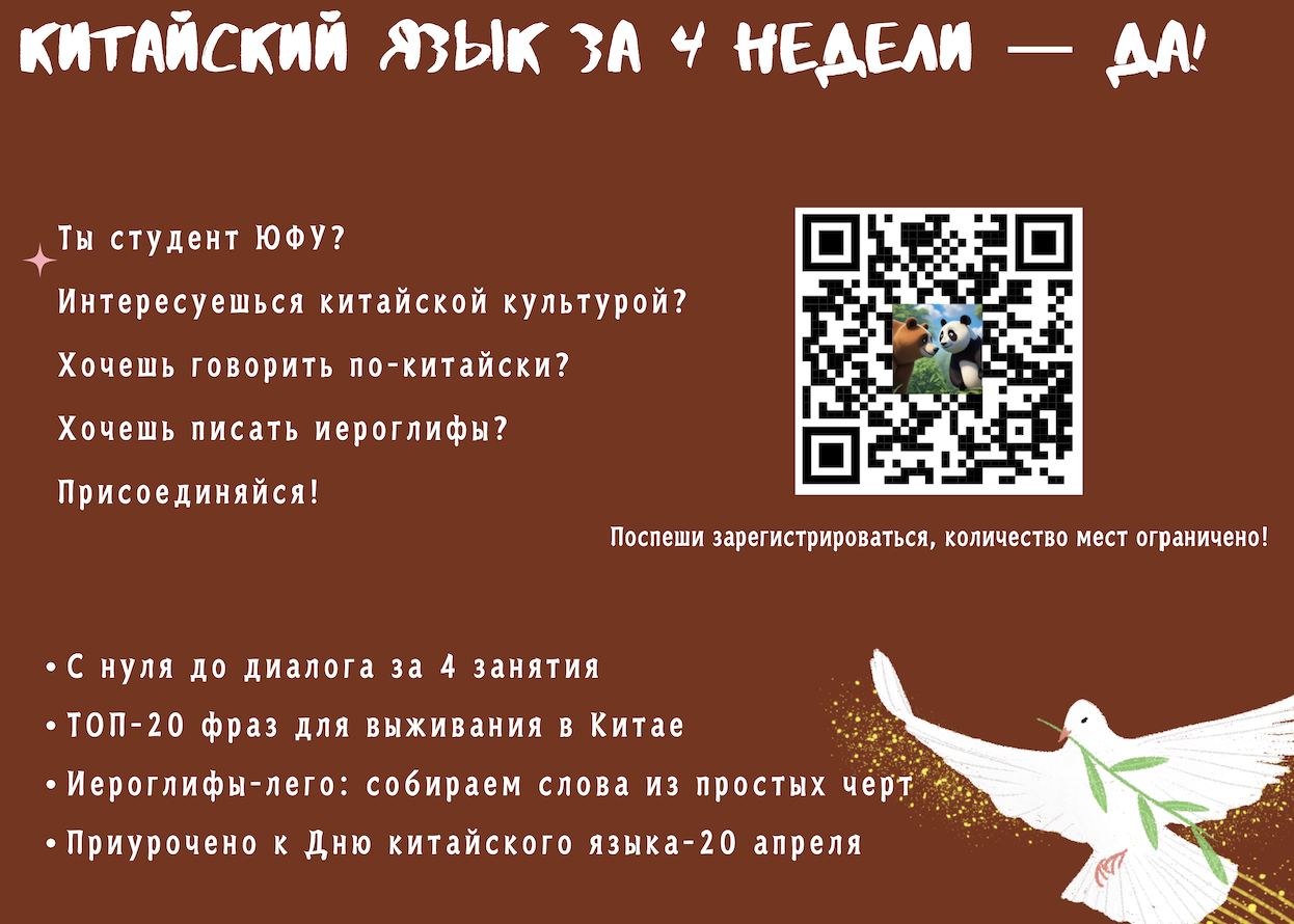 Время проведения: каждый понедельник в 17:30 (24 марта — 21 апреля). На заключительной встрече состоится празднование дня китайского языка