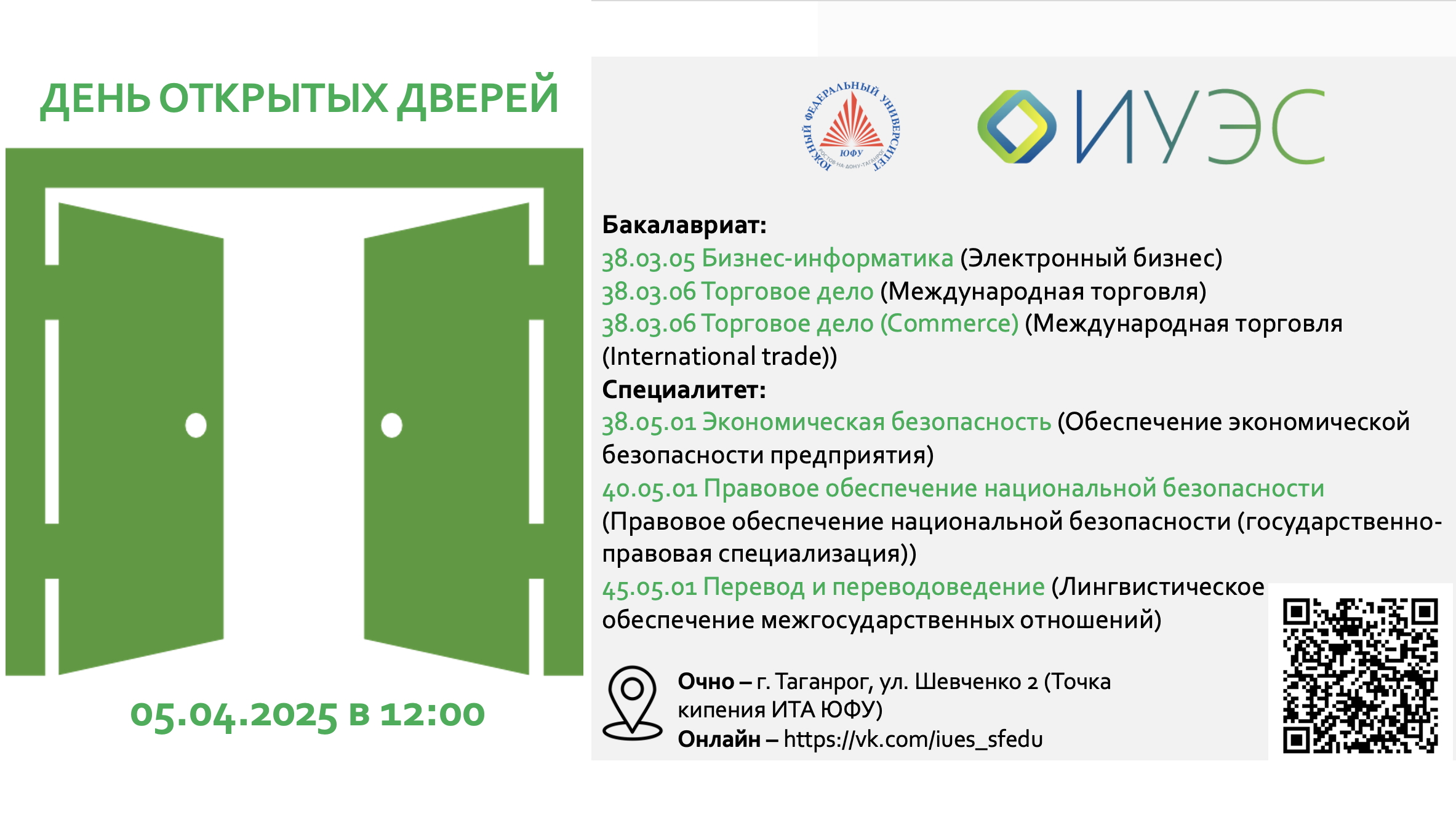 05 апреля 2025 года в 12.00 Институт управления в экономических, экологических и социальных системах ЮФУ проведет День открытых дверей: направления бакалавриата и специалитета. Для участия в мероприятии приглашаются выпускники школ и средних учебных заведений, а также все заинтересованные лица.