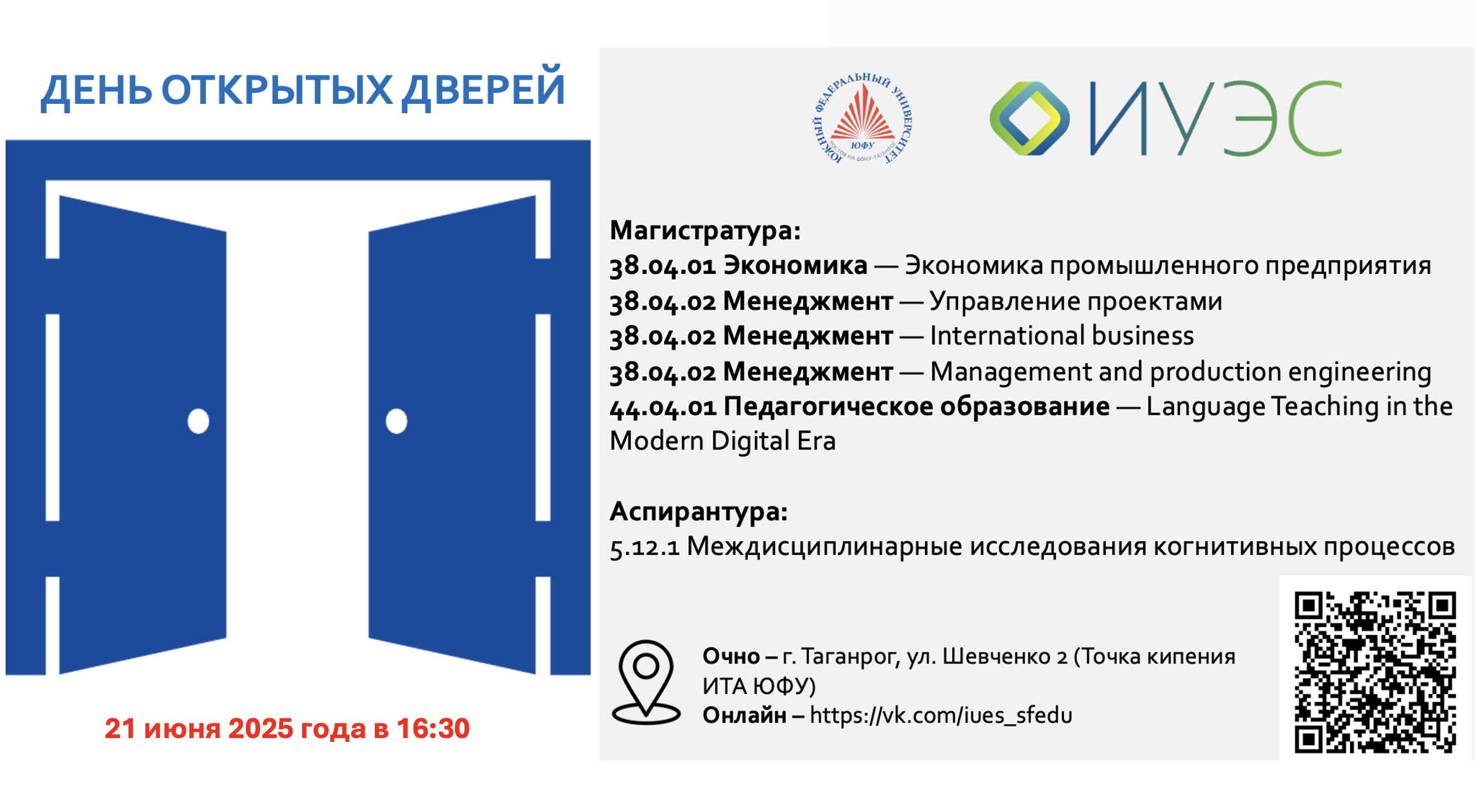 21 июня 2025 года в 16.30 Институт управления в экономических, экологических и социальных системах ЮФУ проведет День открытых дверей по программам магистратуры и аспирантуры. Для участия в мероприятии приглашаются лица, имеющие диплом о высшем образовании, или выпускники 2025 года.