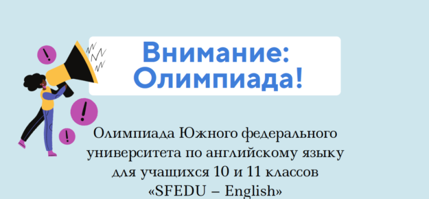 Кафедра лингвистического образования Института управления в экономических, экологических и социальных системах Южного федерального университета приглашает учащихся 10-11-х классов принять участие в Олимпиаде Южного федерального университета по английскому языку «SFEDU – English». Победители и призеры Олимпиады Южного федерального университета по английскому языку «SFEDU – English» получат дополнительные баллы в качестве индивидуальных достижений при поступлении на специальность…