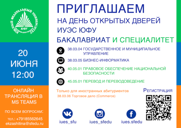 20 и 21 июня Институт управления в экономических, экологических и социальных системах при поддержке Точки кипения ИТА ЮФУ провел Дни открытых дверей онлайн по направлениям бакалавриата и специалитета и программам магистратуры! В 2020 году ИУЭС ЮФУ объявляет набор (бюджет и полное возмещение затрат) по следующим направлениям и программам: Бакалавриат: 38.03.04 Государственное и муниципальное управление (10…